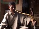 G. A. Majboor: What brings life is dedication from childhood. Our ancestors, my father, grand father, they used to learn right from childhood. It is a tradition here, the 'bhand' here, there are about 80 villages here - of the Bhands, in Kashmir. Every village has an intellect (mahaguni). Every intellectual person had an designated area which the king had marked. In the days of the king, the 'bhand' was tax free. They didn't have to pay any tax. Their job is to entertain people. They used to perform starting from when seeds are sown upto the harvest time. They traveled village to village to perform and in return got food, clothes and some money. That day people did not have money, but if there was a rich person, he even gave money. They used to take grains from the people for entertaining them for 2 months. Now that is not the case, so why should we go around asking for grains! Surely they used to take kids also with them. When they went on tours there were 100 year old men also and a 6 year old kid too. So that is when the training started for the kid. Till the age of 10 he just sits and watches the 'pather' being performed. But after that they were given entry in the plays and were asked to do something or the other. In this way a child learnt on his own, automatically. In the winters, when it snowed, classes were held, and training was imparted for surnai, dance, singing. They were taught as to what is beat, what speed, what tune, which instrument should be played when etc. These things no longer exist. Kids go to school, and those whose kids don't, they expect their kids to start earning. Someone makes carpets, some are in the market, as you must have seen how much has child labor increased. So now when a fully grown man attempts to learn surmai, he barely manages it. Because there is a period when a child can learn, if that is gone, then...... (Nods his head), then it is possible with a lot of difficulty.